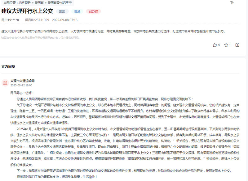 太阳 - 9月25日(记者Mu Shengyu),“建议轻松推出与城市公共汽车价格相同的机票价格的水车,考虑到公民的一天 - 到城市的日期流量以及城市旅游业的发展。它不仅增加了当地交通选择。不仅可以增加一个城市的名片,而且还提高了一个城市的名片城市,还提高了dali netran of the dali。每天的领导力。销售 - SUN-“消息领导”的人信息并回复屏幕截图。收到消息后,市政交通局立即将消息传递给了相关部门进行调查和验证,并回应了网民的建议。 “经过证明后,您的相关建议是合理的。”达里市政交通局在其信息中引入了以“村庄 - 村庄到村庄到村庄到村庄到village到vill”的迅速进展来回答年龄到村庄到村庄到村庄到村庄的运输线不断改善。近年来,私人汽车和在线呼声的迅速人口已成为一种补充,在旅游高峰期间,诸如暑假和夏季假期等人民政府批准的诸如夏季假期和暑假之类的严重交通声名很高码头和渡轮;其次,无法根据当前的运输土地情况建造码头和渡轮的新建筑和重建。渡轮主要集中在Erhai Lake的村庄和城镇中,并且存在一个匹配困难的广泛问题。不能为水巴士建造条件;第三,现有的船舶类型不适合能够使用巴士渡轮。现有的Erhai Lake Cruise船专为旅游船的性质而设计,具有低速,效率和高成本,不适合快速分发公交车。根据“达利·拜(Dali Bai)自治区的“埃尔海湖(Erhai Lake)的保护和管理法规”的相关规定,云南省(Yunnan Province)是“实施了Erhai Lake区的船只上的全部控制,联合管理和加入系统”,很难建造新的水船。达利市政运输局表示,在下一步中,它将继续对Erhai Lake进行保护和管理,因为它积极提高巡航并考虑开发水车。