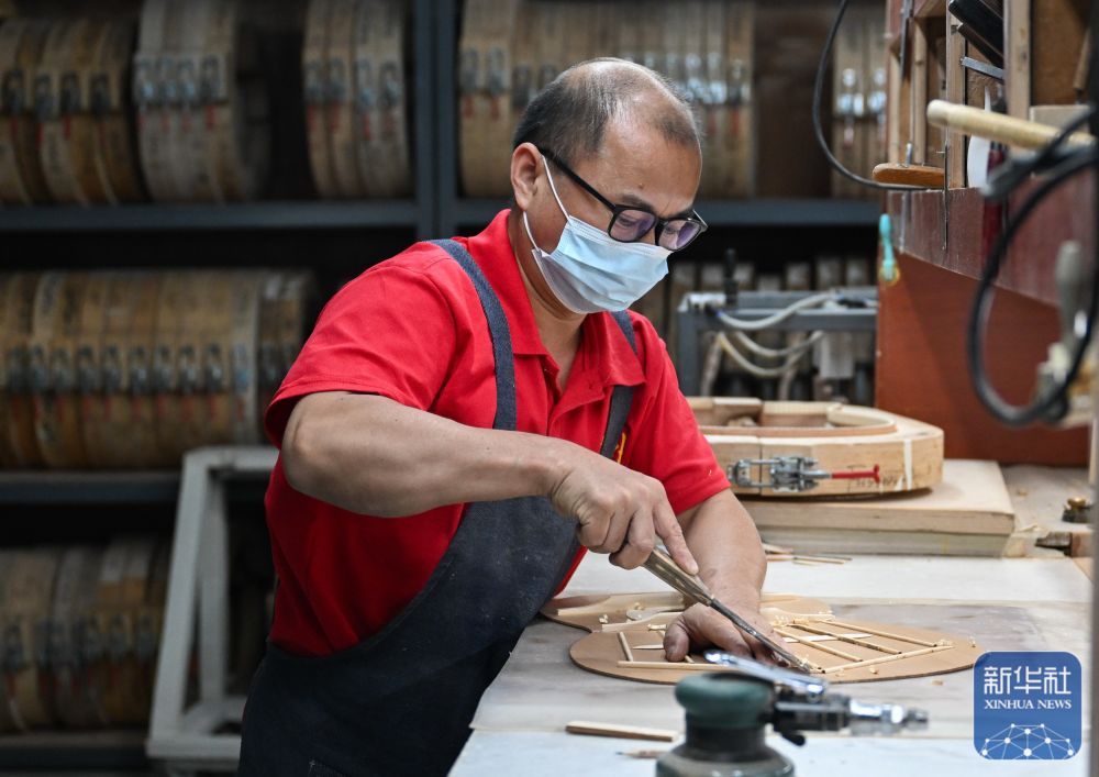 ↑8月28日,工人正在吉他做吉他伴侣的研讨会Y在湖北省的Songzi City。